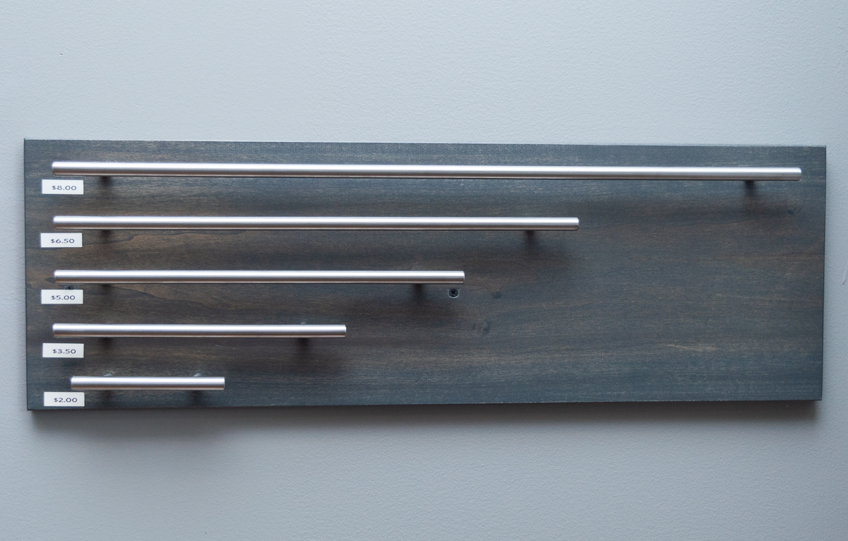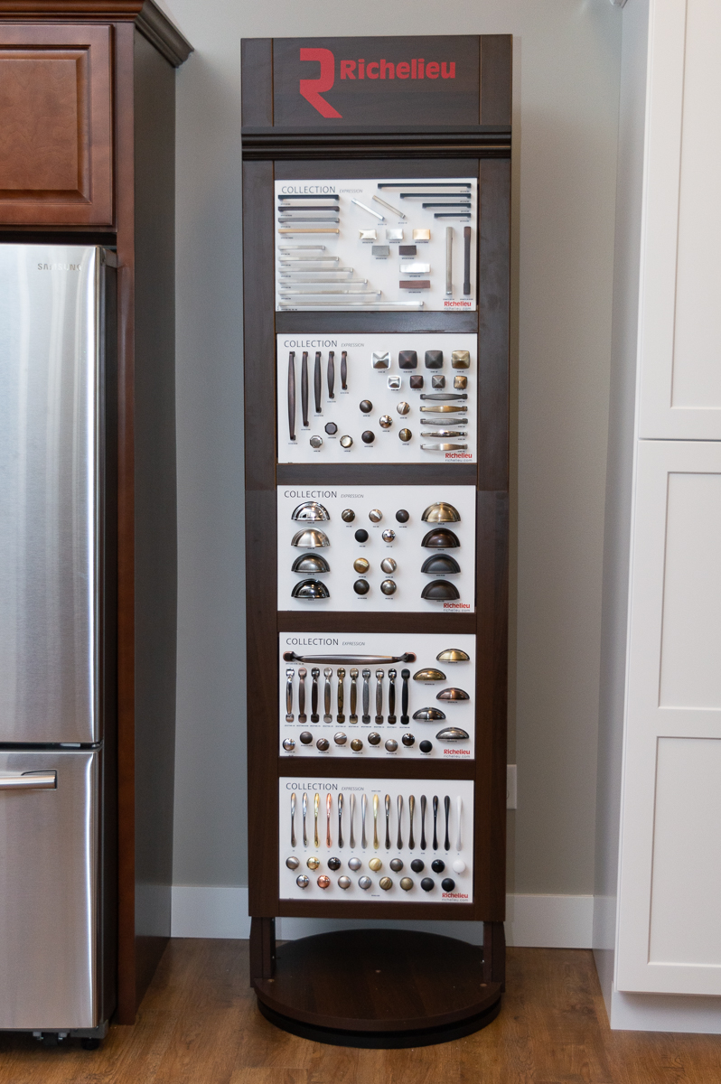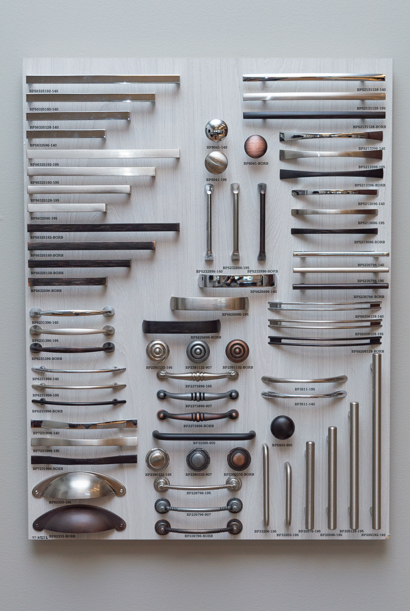 We carry a full line of door styles and finishes. We even offer the ultra-modern, frameless cabinets. And we stock two styles, one dark and one light, at an unbeatable price in case you need cabinets right away. We can also add custom color finishes for that “one-of-a-kind” look. While we offer a comprehensive set of options, we work to simplify the selection, so you never feel overwhelmed by the choices.